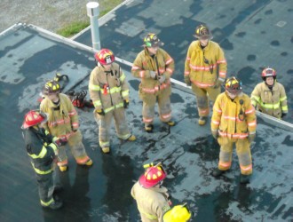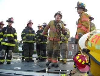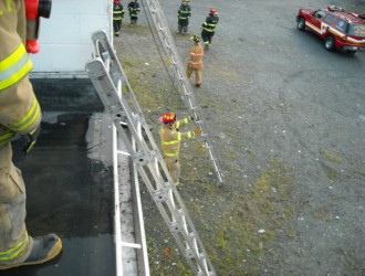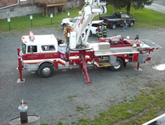 raising the aerial and explaining roof operations. Meanwhile, ladders from